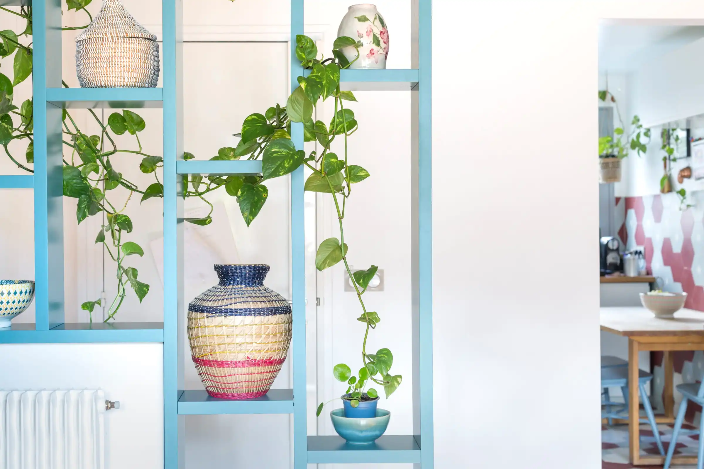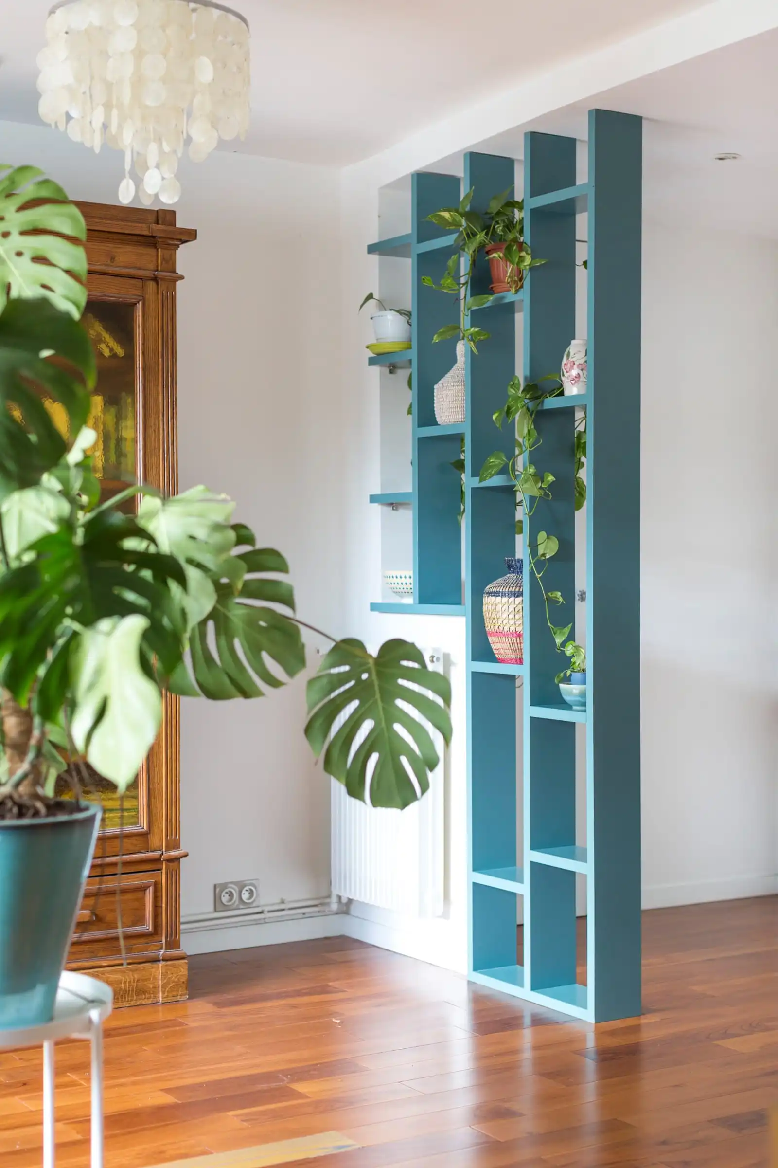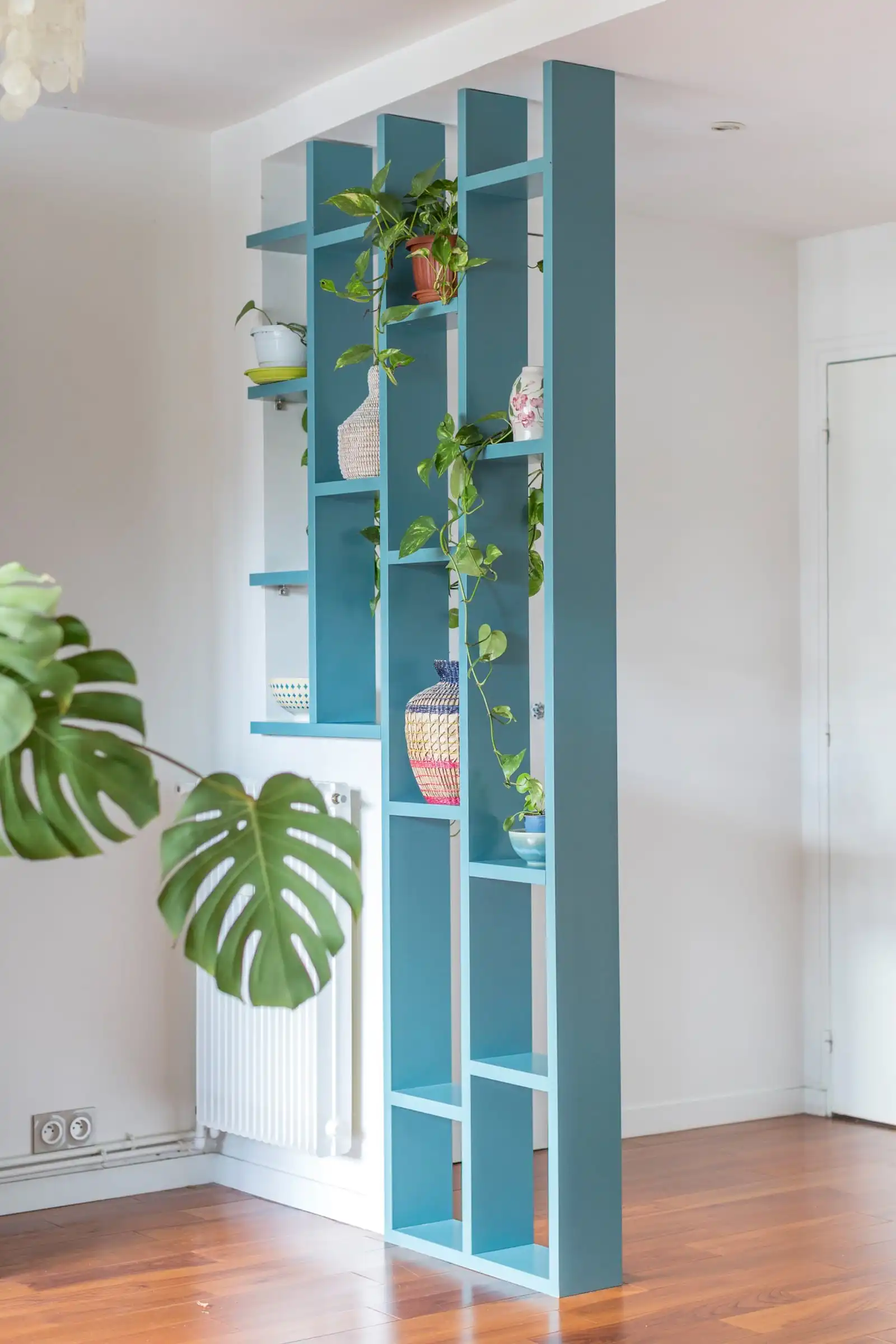 Grâce aux étagères ouvertes sur deux faces, le meuble devient un support d’expression décorative. Il permet de valoriser des objets personnels tout en apportant du rythme à l’espace d’entrée. Cette réalisation démontre qu’il est possible de délimiter sans enfermer, avec style et légèreté.