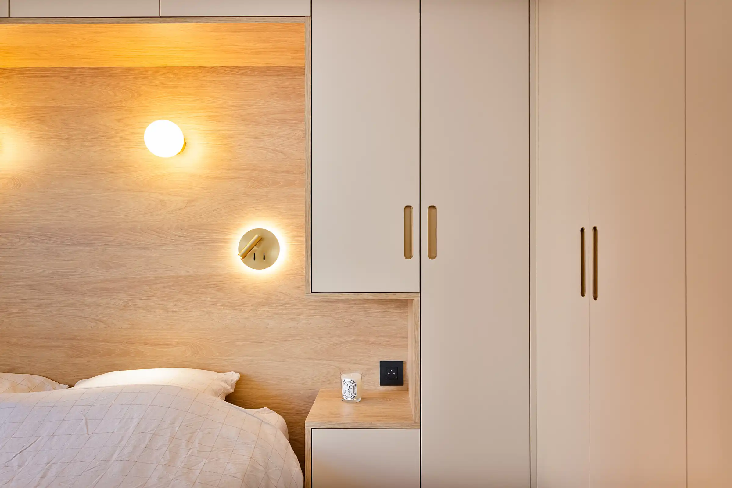 Deux appliques orientables ainsi qu’un point lumineux central sont directement intégrés à la tête de lit. Leur positionnement assure un éclairage confortable pour la lecture, sans éblouir, tout en participant à l’ambiance apaisante de la chambre. Les commandes et prises ont été discrètement encastrées dans les panneaux latéraux.