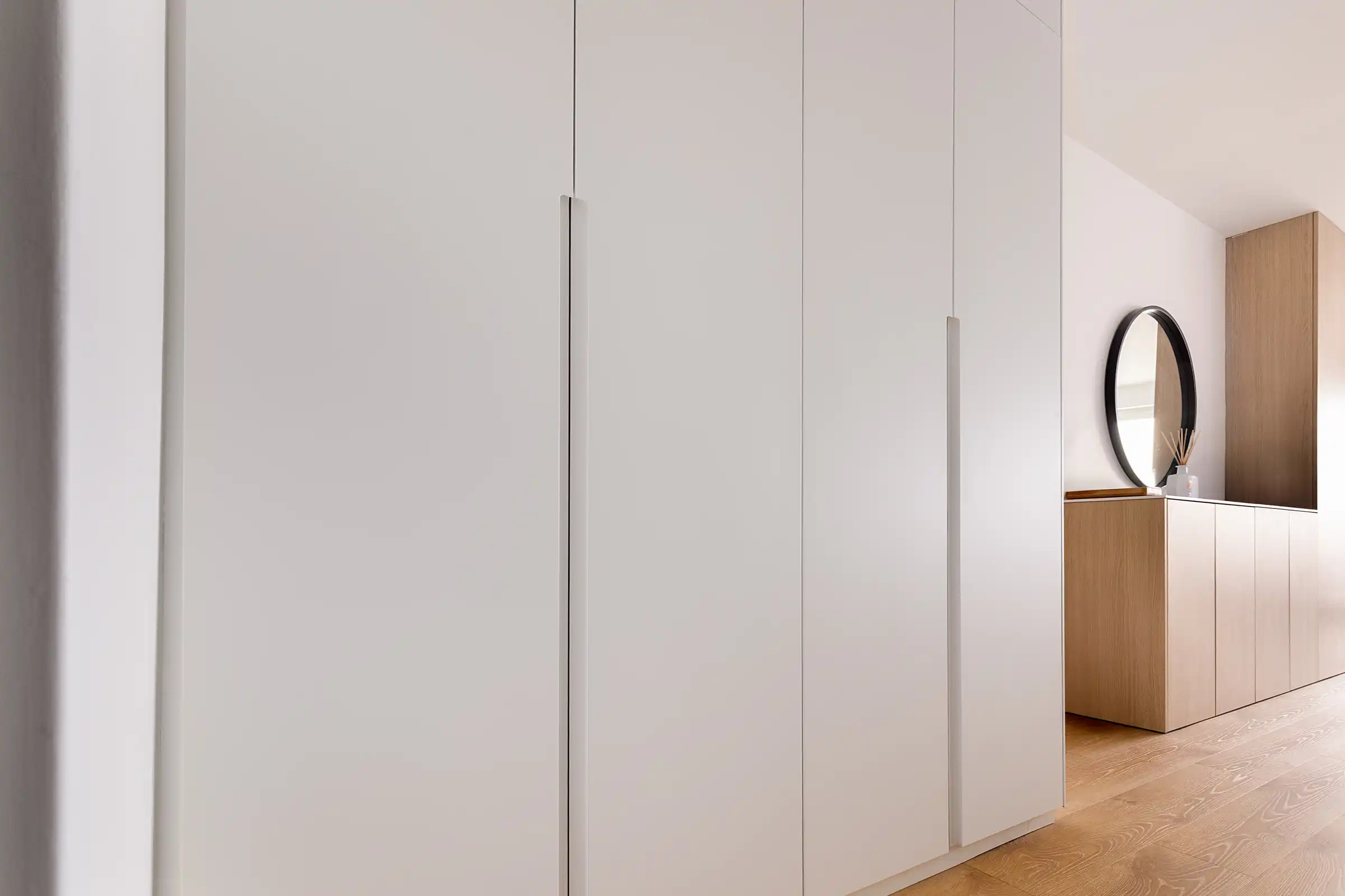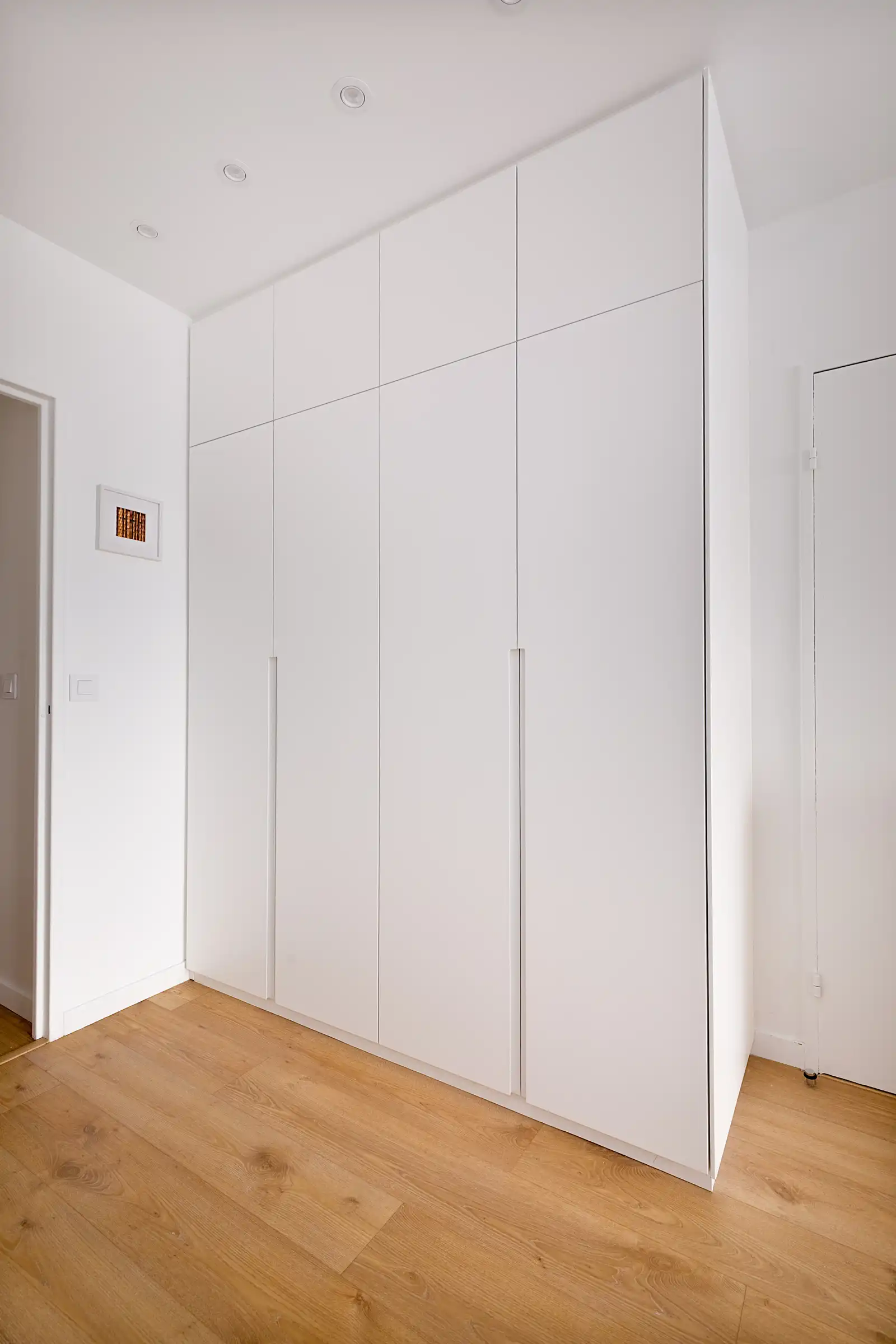 L’ensemble du meuble adopte une ligne sobre et épurée, sans poignées apparentes. Le choix de portes battantes en finition blanc mat accentue la luminosité de l’entrée tout en renforçant l’élégance discrète du projet.