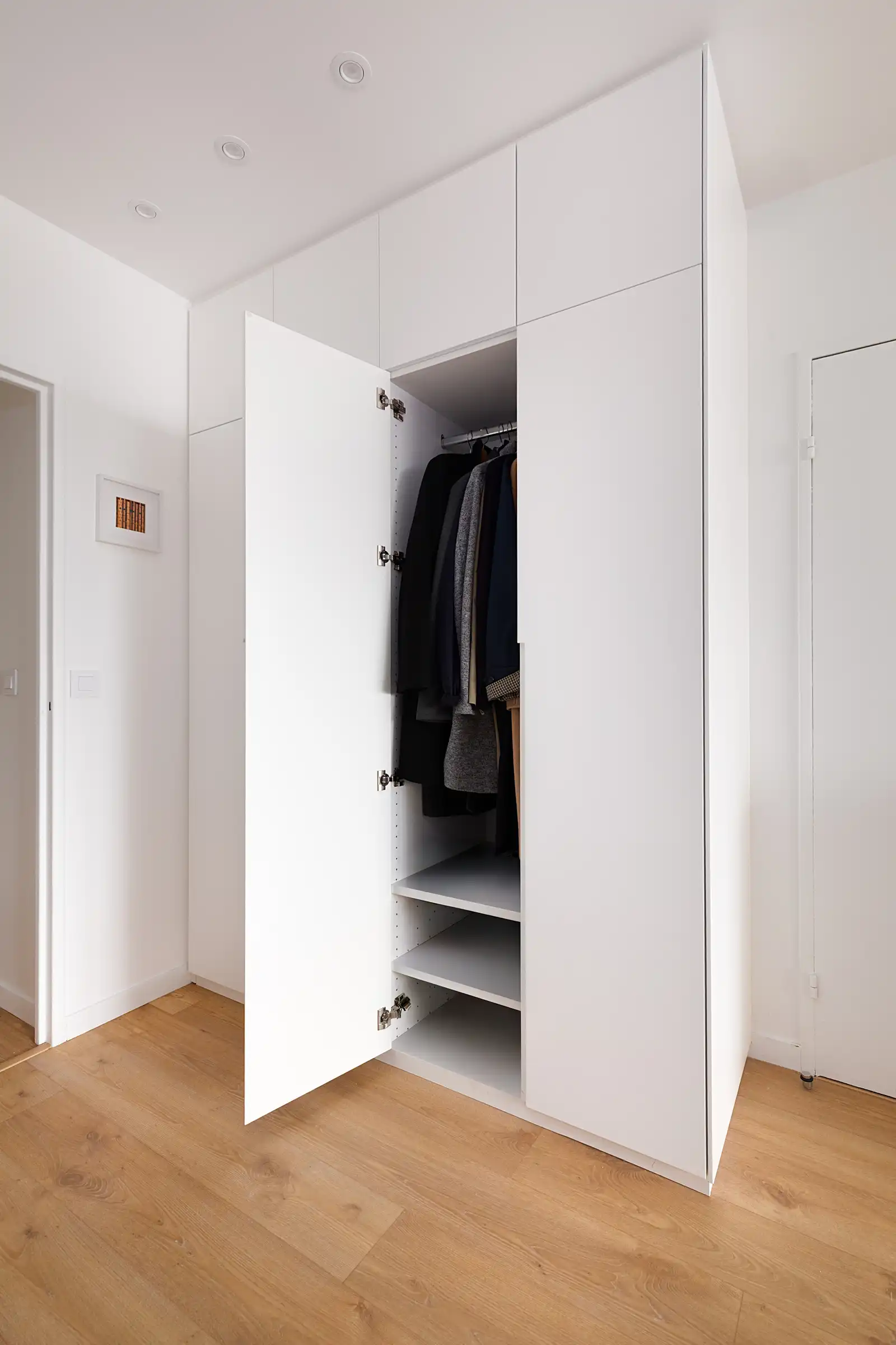 Le vestiaire se compose de placards toute hauteur et d’une penderie équipée d’une tringle, offrant une solution complète pour suspendre manteaux et vestes. Des étagères ouvertes viennent compléter l’aménagement, facilitant le rangement des accessoires du quotidien.